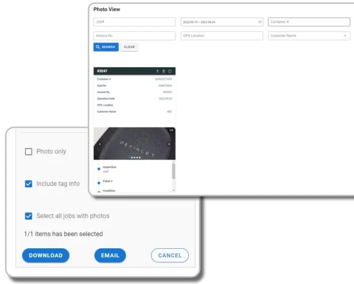 チームや顧客と共有したい時は、写真を選んでEメールボタンをクリックするだけ。また関連情報付きの写真レポートも簡単に出力できます。